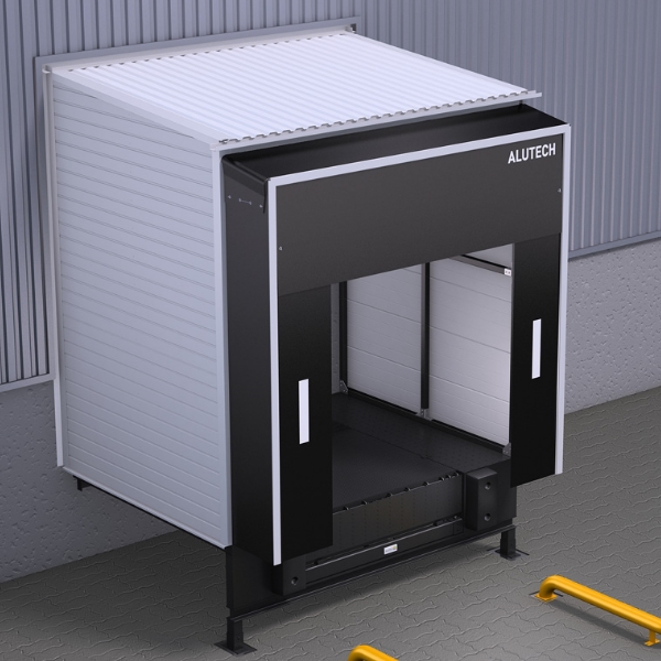 Главная / Перегрузочное оборудование / Перегрузочные тамбуры / Перегрузочный тамбур Alutech DH (120 градусов, заполнение сэндвич-панель)